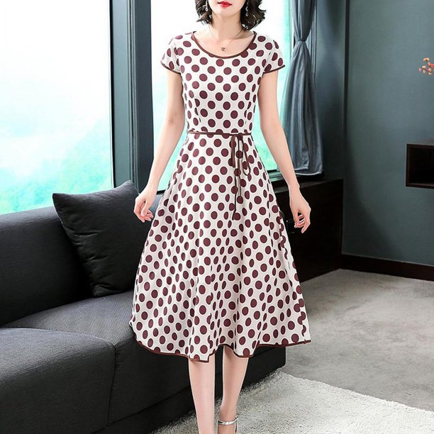 Women Dresses Fashion Casual Summer Short Sleeve Dress Dot Printing A Line Dress Beach O Neck Office Ladies Dress With Belt Walmart Com