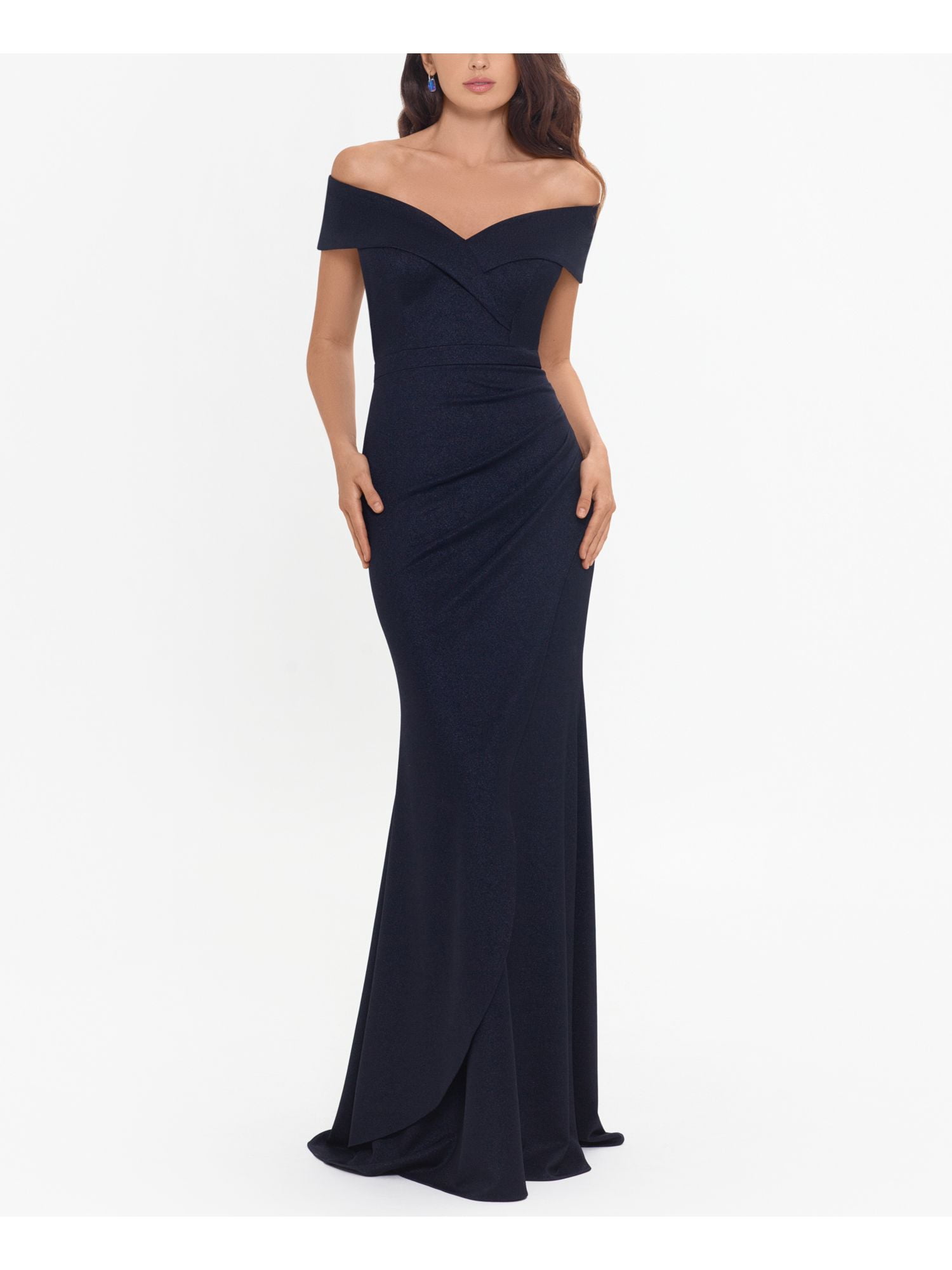Xscape Womens Navy Stretch Zippered Metallic Cap Sleeve Off Shoulder Full Length Evening Mermaid Dress 12 Walmart Com